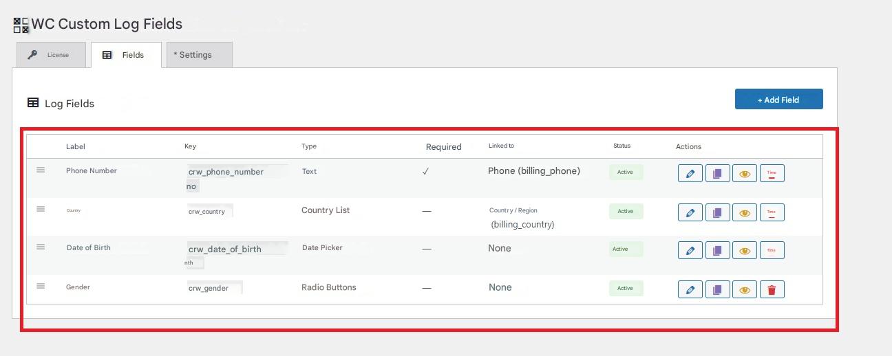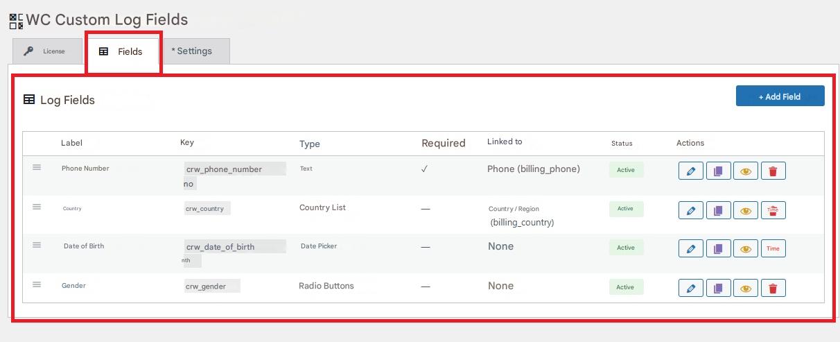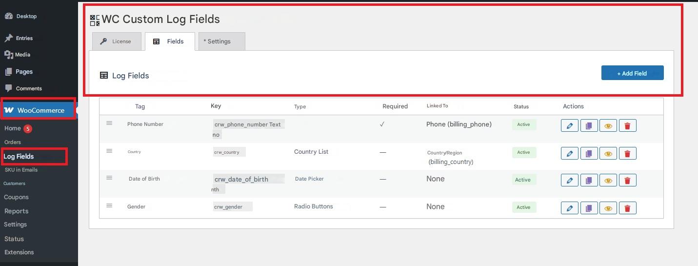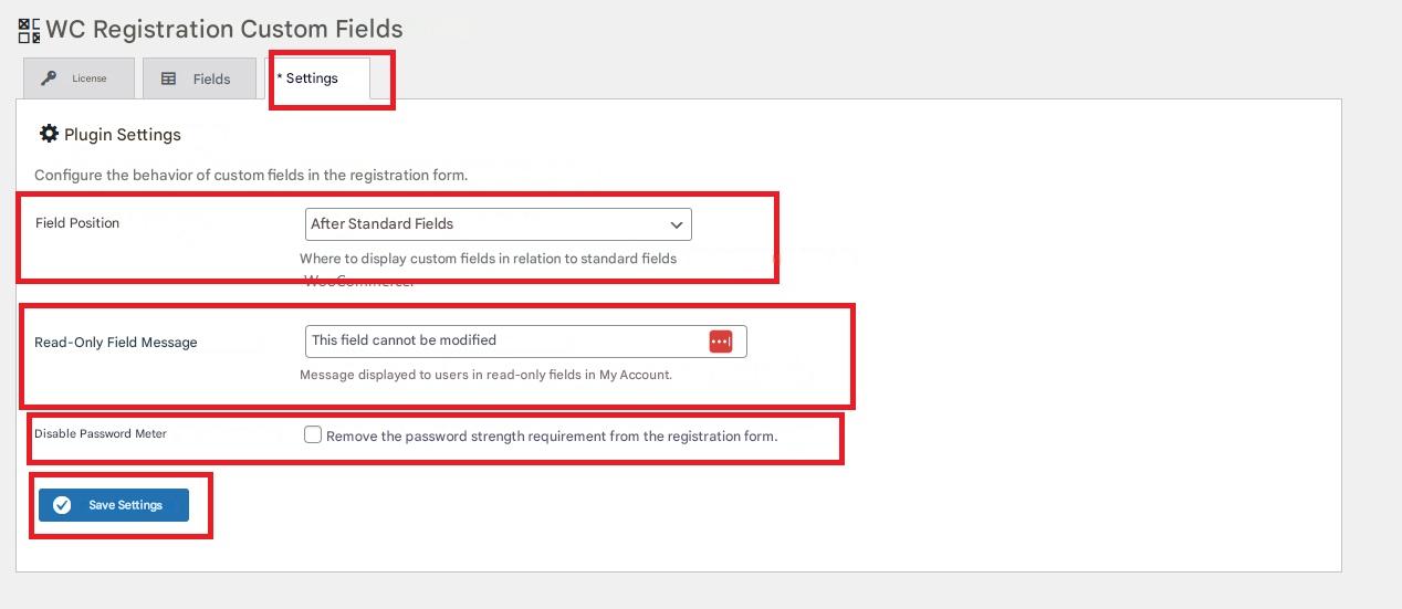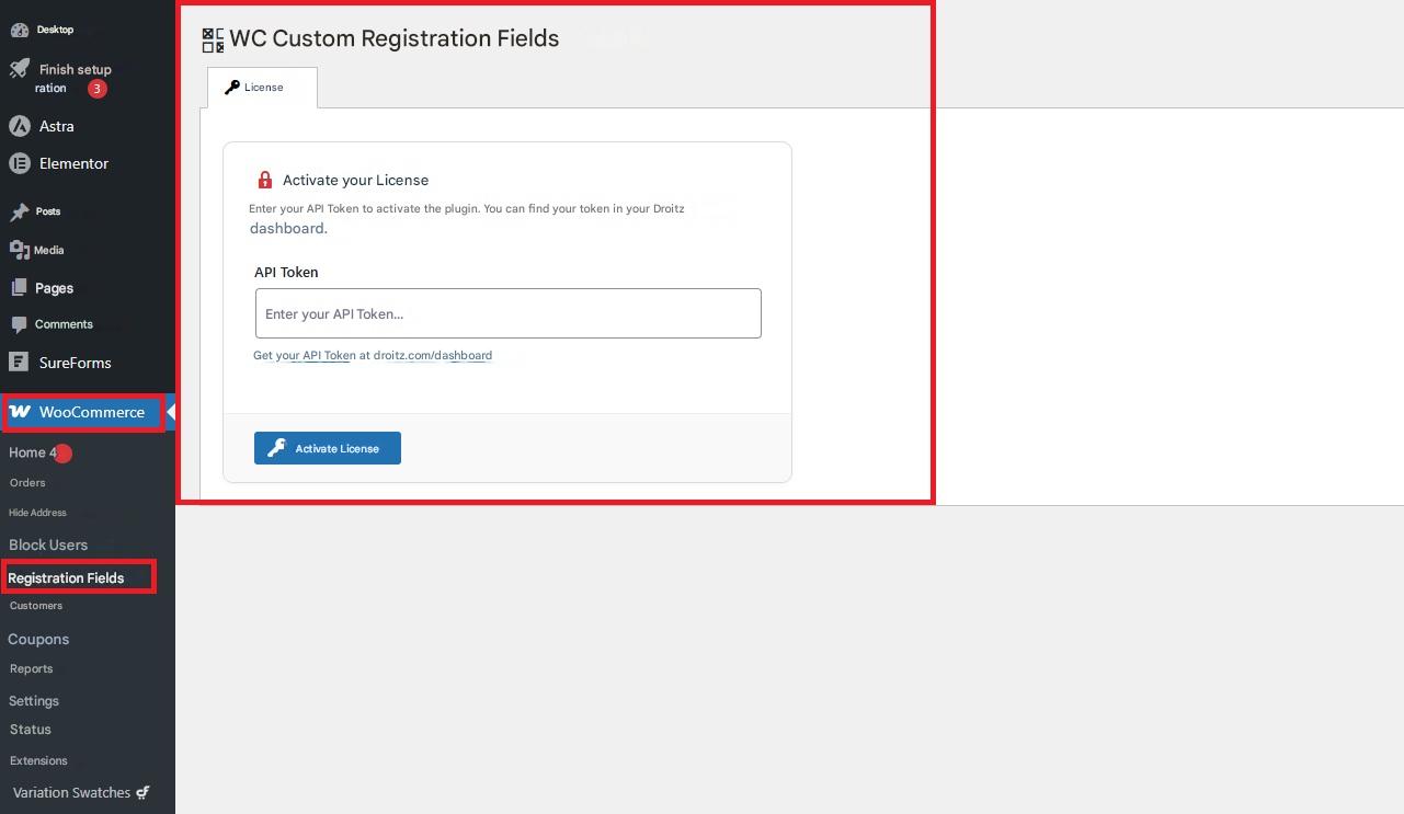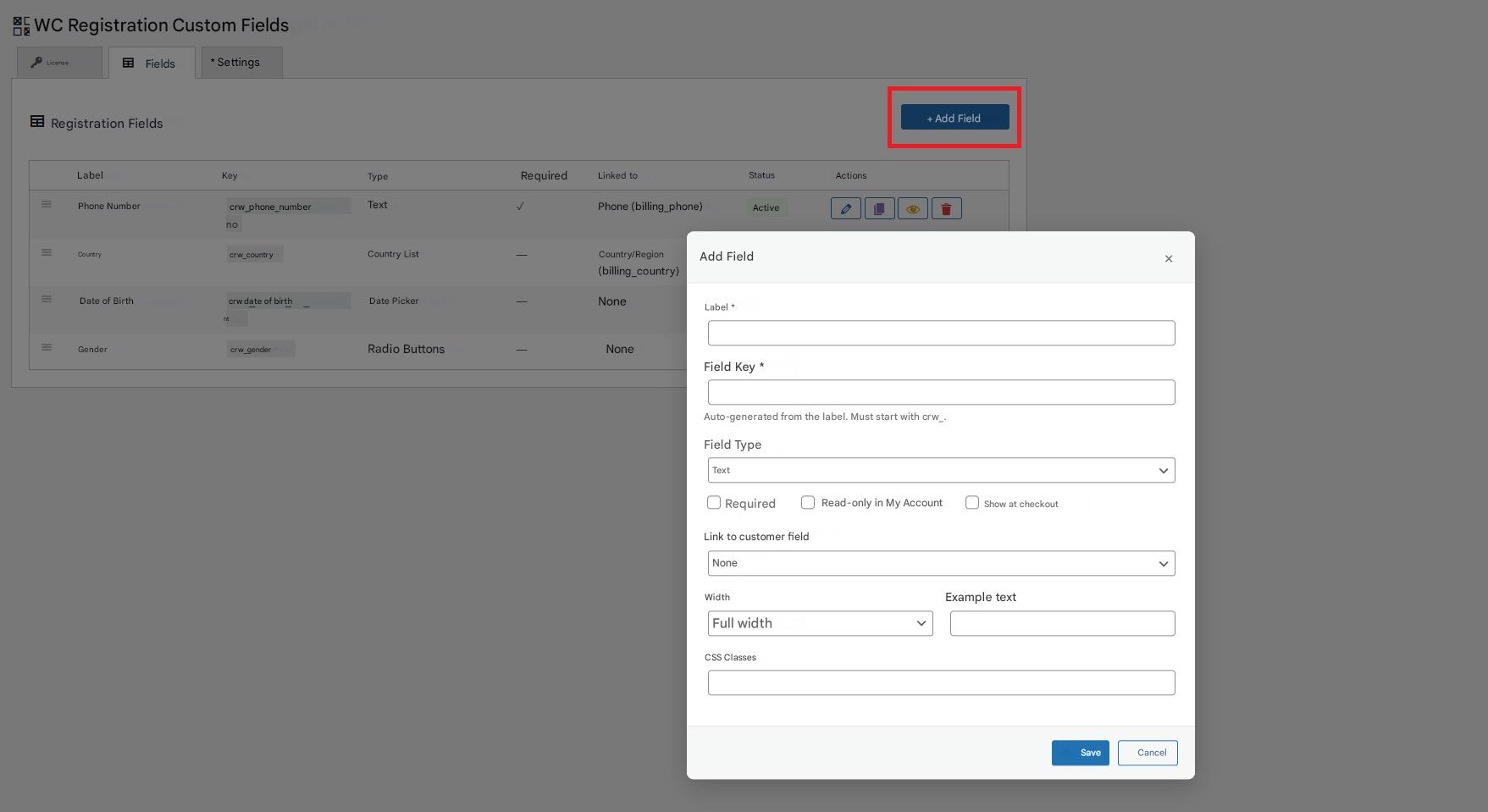 1. Go to WooCommerce → Registration fields in your WordPress dashboard.
