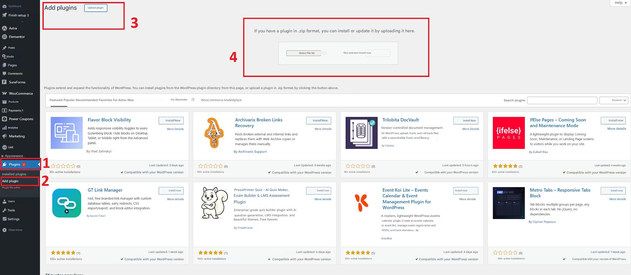 2. In your WordPress dashboard, go to  Plugins → Add New → Upload Plugin .