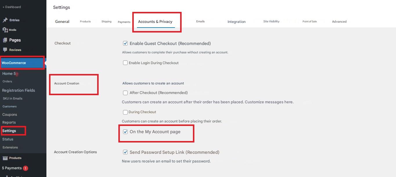 • Enable account creation: Go to WooCommerce > Settings > Accounts & Privacy, and in the account creation section, enable the “On the ‘My Account’ page” option. This will allow users to sign up directly from that page.