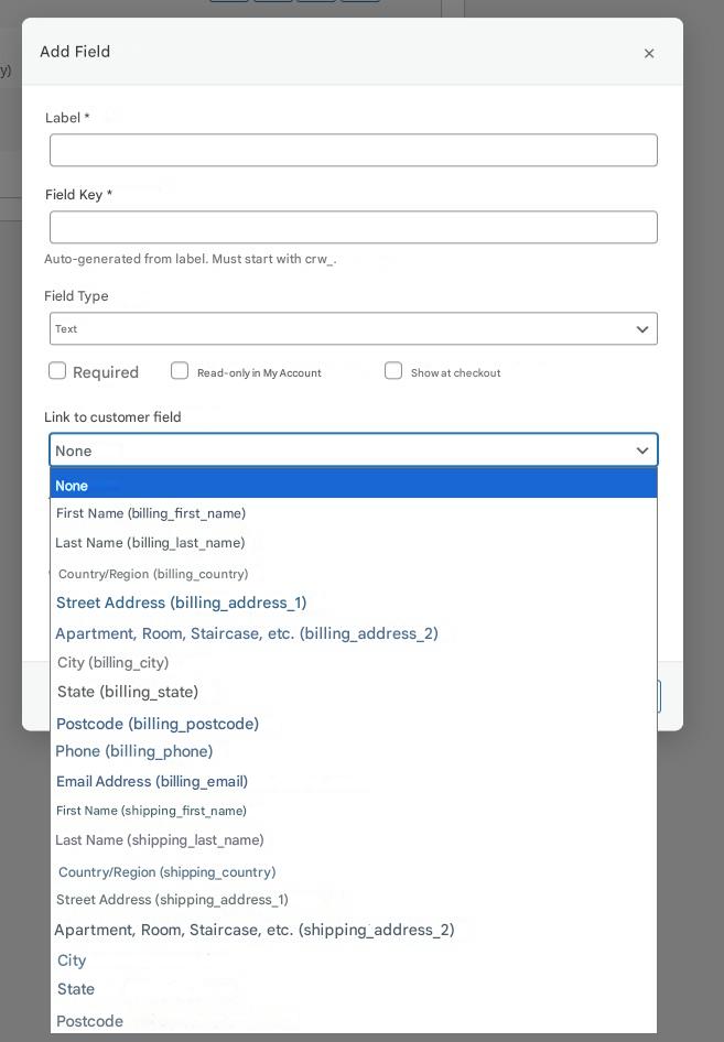 In the list of fields, options such as billing and shipping will appear in parentheses, indicating what type of field they can be linked to:
