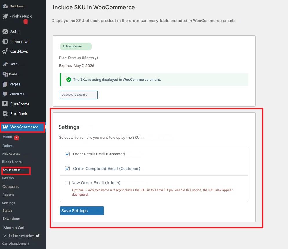 1. Go to WooCommerce → SKU in Emails to configure the available options. Select only the ones you want to use: