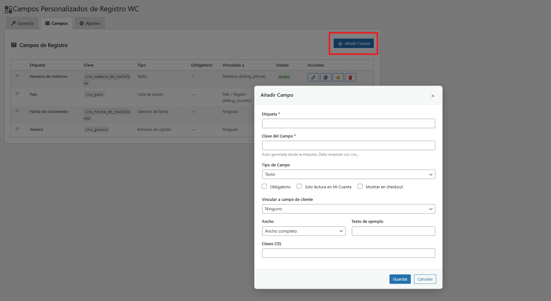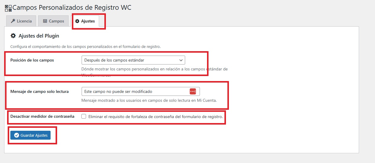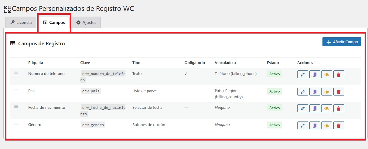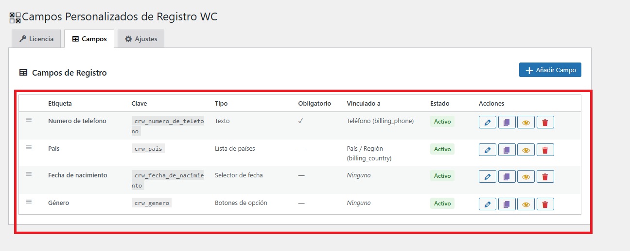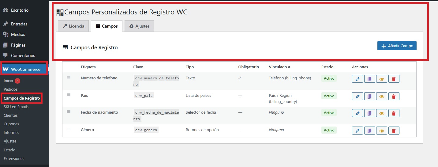 Para configurar el plugin, debemos ir a WooCommerce → Campos de registro.