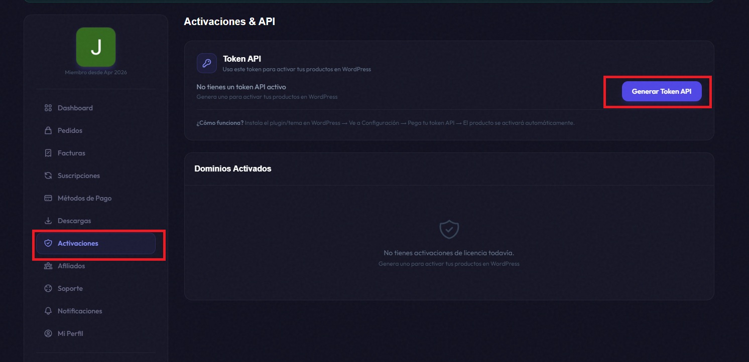 3. Dirígete a la  sección de Activaciones y genera tu  token de API .
