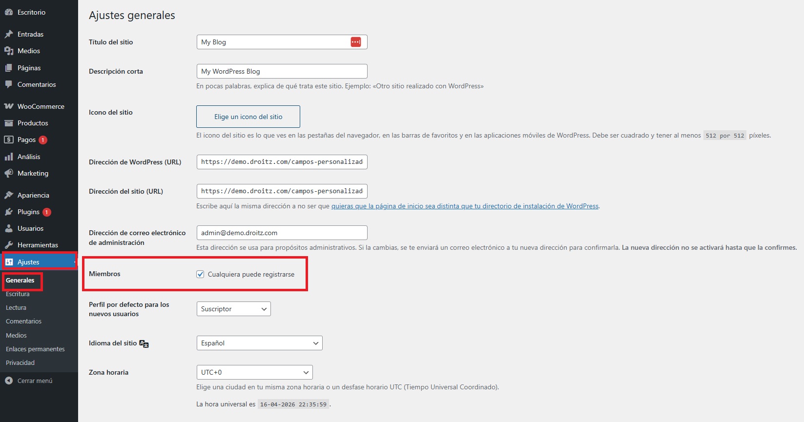 • Activar el registro para cualquier persona: Ve a Ajustes > General y, en la sección Miembros, activa la opción “Cualquiera puede registrarse”. Con esto habilitarás el registro de usuarios en el sitio.