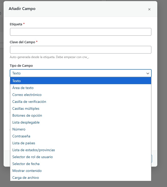 Aquí encontrará múltiples opciones para el tipo de campo que necesita, desde un campo que le permite escribir texto, una sección para marcar opciones, hasta una sección para cargar archivos.