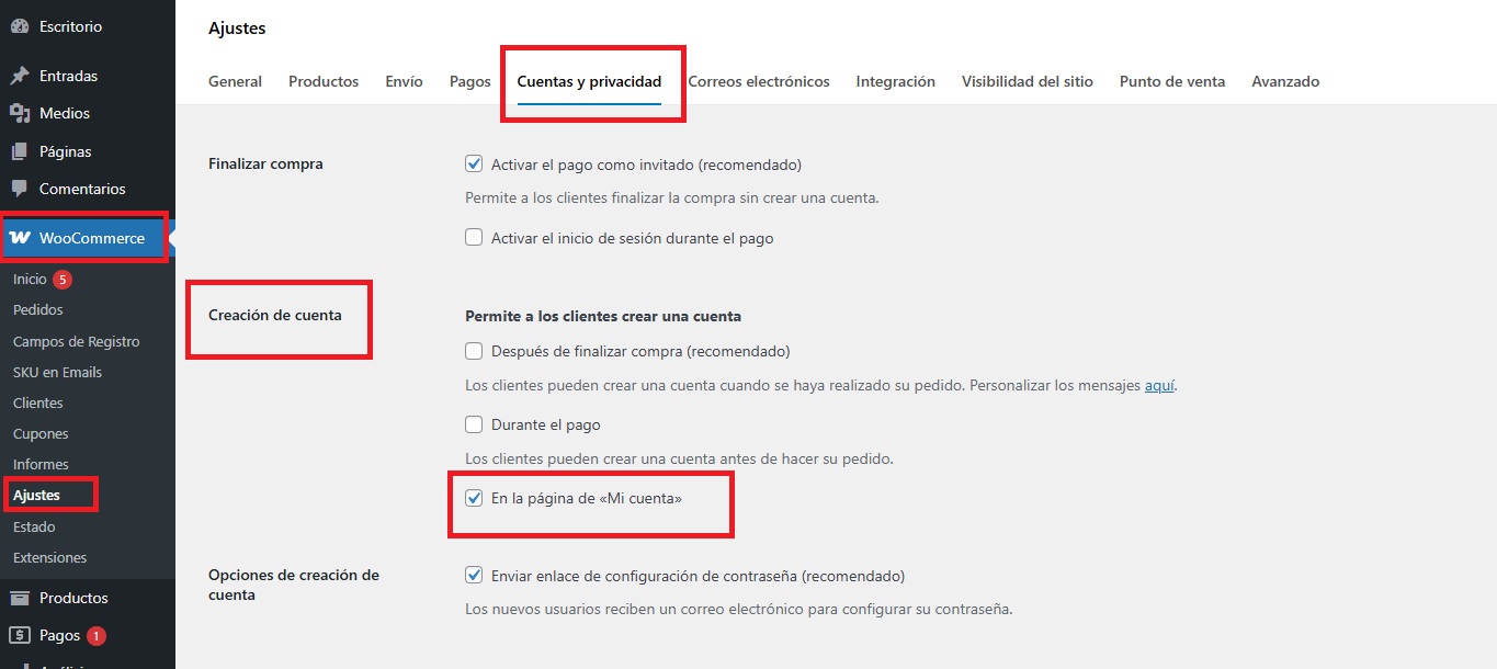 • Activa la opción de creación de cuenta: Ve a WooCommerce > Ajustes > Cuentas y privacidad y, en la sección de creación de cuenta, activa la opción “En la página ‘Mi cuenta’”. Así, los usuarios podrán registrarse directamente desde esa página.