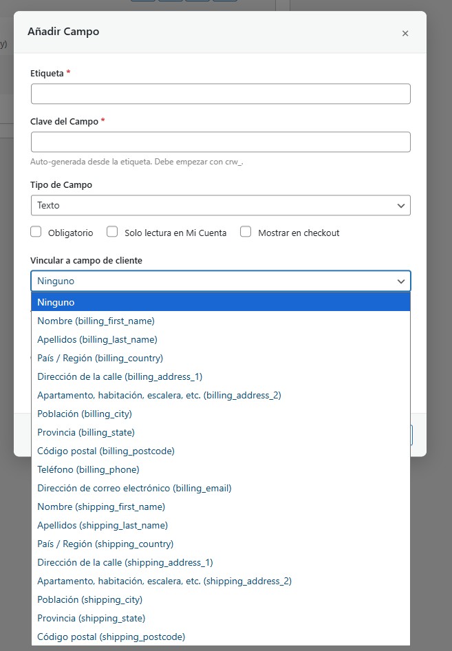 En la lista de campos, las opciones como Billing y Shipping aparecerán entre paréntesis, indicando a qué tipo de campo se pueden vincular: