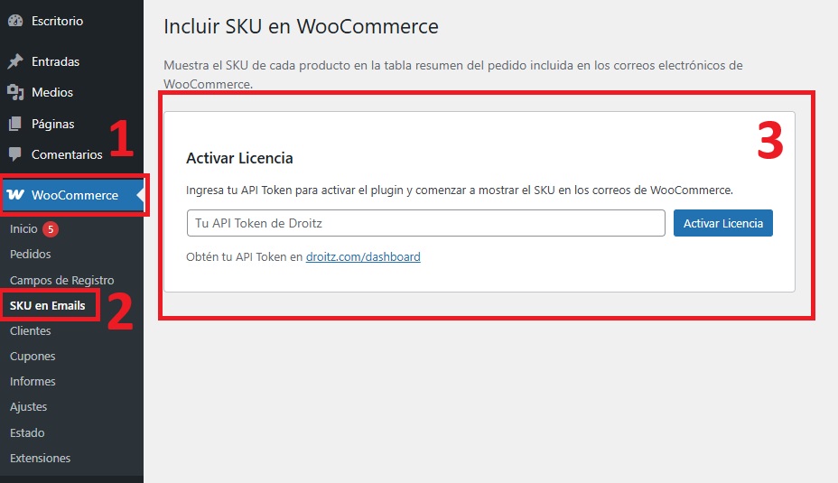 - Ve a WooCommerce → SKU en Emails en tu panel de WordPress.