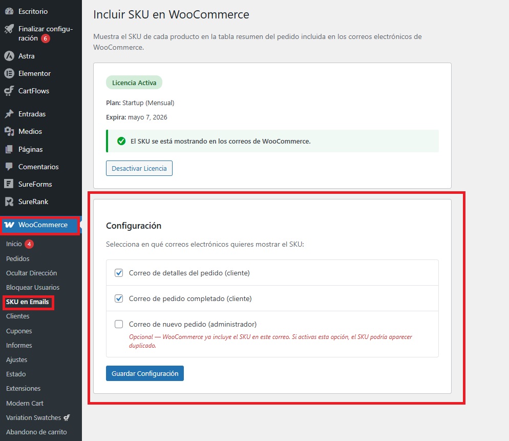 - Accede a WooCommerce → SKU en Emails para configurar las opciones disponibles. Marca únicamente las que desees utilizar.