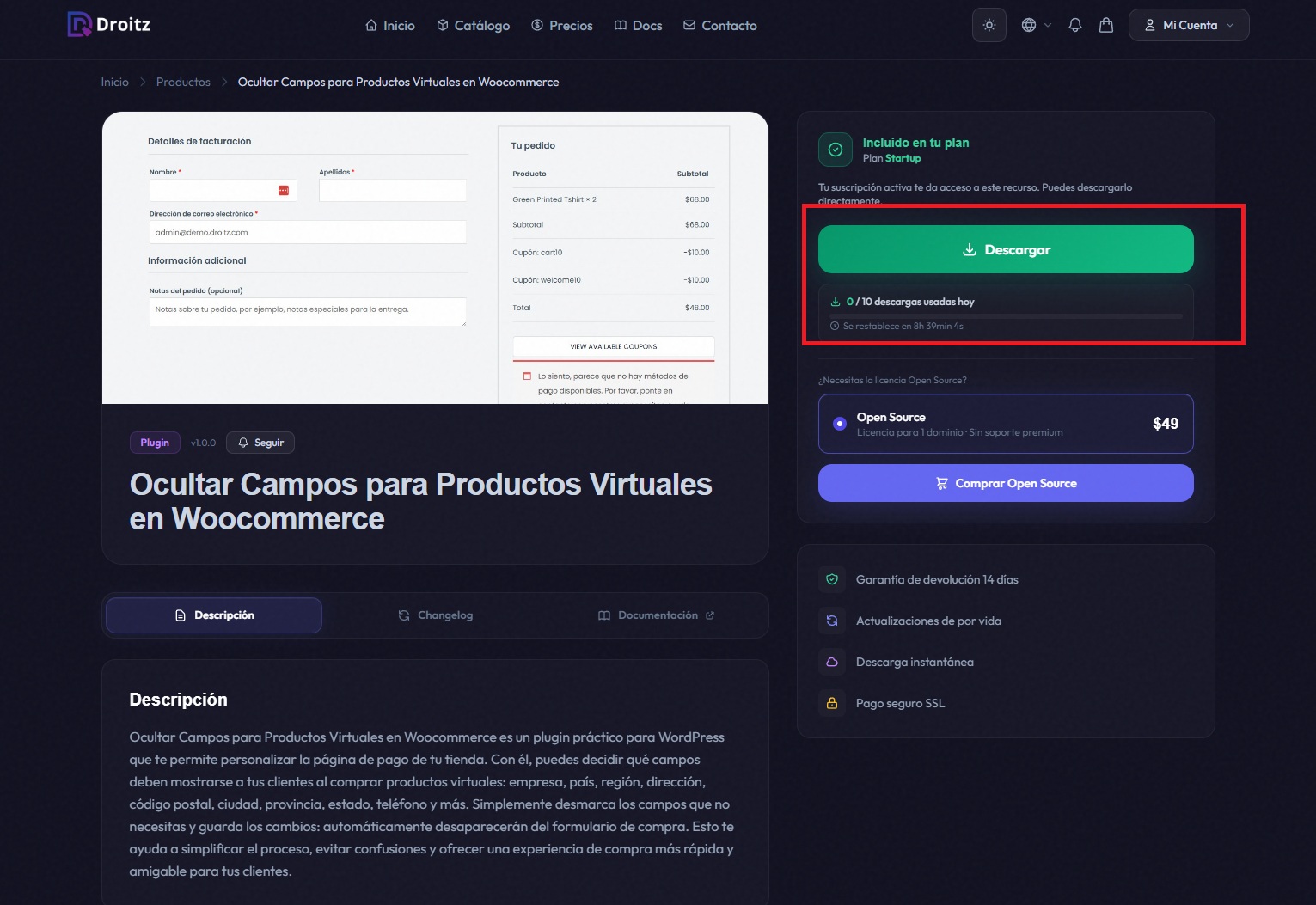2. Una vez adquirida la licencia, descarga el archivo del plugin en formato .zip.