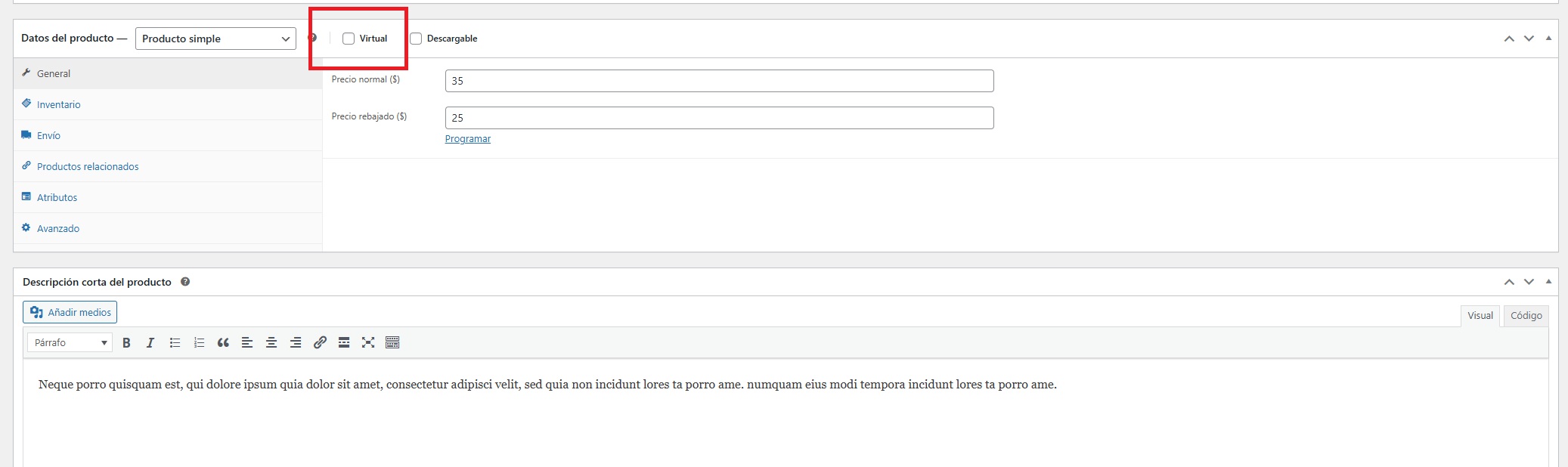 2. Edita el producto que deseas configurar y marca la opción “Virtual”. Este paso es obligatorio, ya que el plugin solo aplica a productos virtuales.