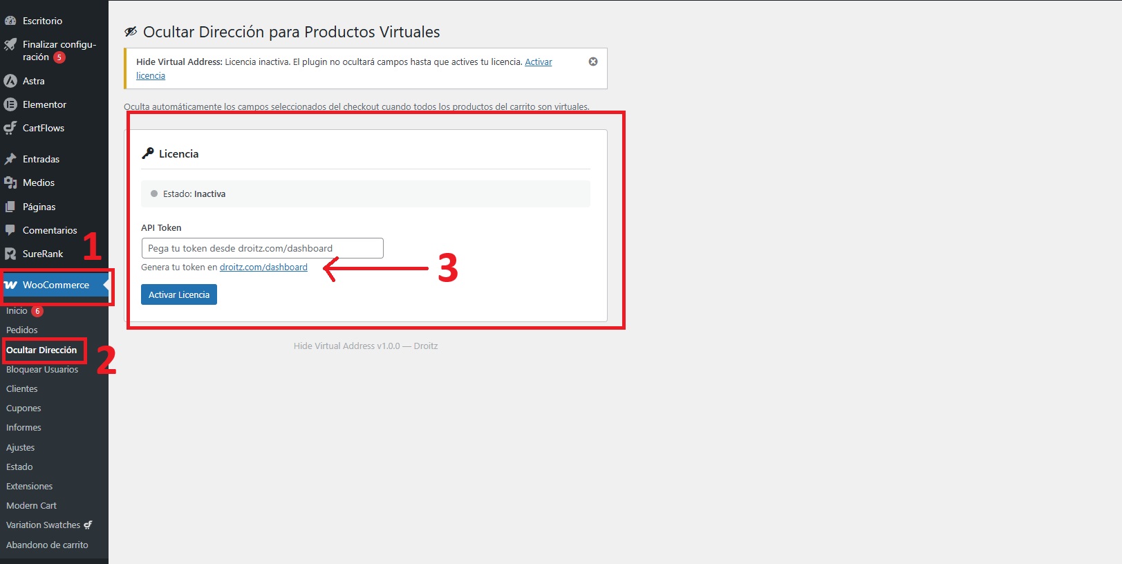 1. Dirígete a WooCommerce → Ocultar dirección dentro de tu panel de WordPress.