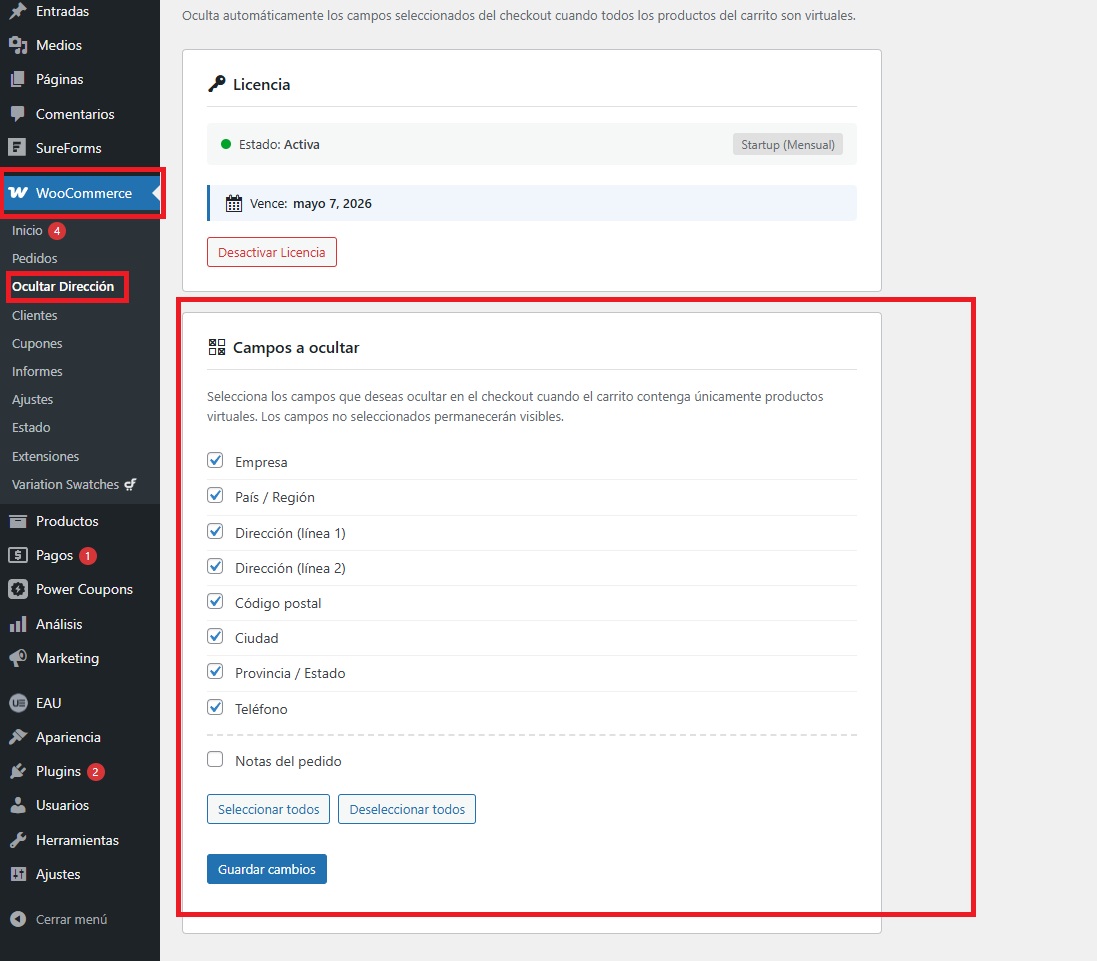 4. Ahora podrás seleccionar qué campos deseas ocultar en el checkout simplemente marcando o desmarcando las opciones disponibles yendo a WooCommerce → Ocultar Dirección.